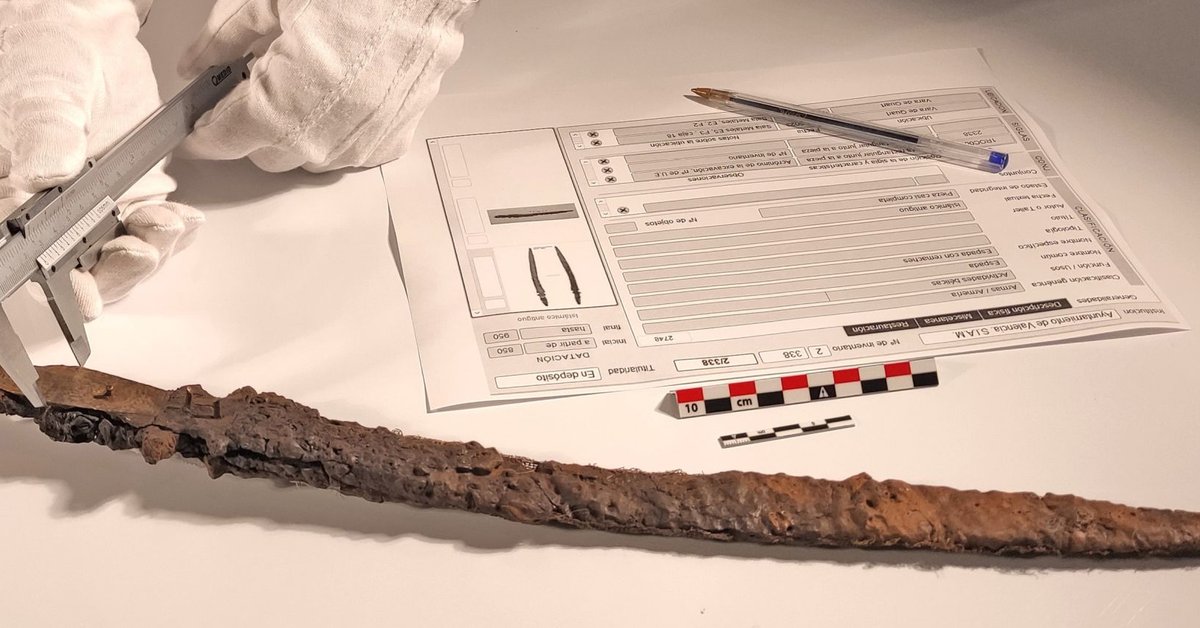 Se descubrió una espada inusual en una casa islámica ubicada cerca de un antiguo foro romano. La hoja mide 46 cm de largo y está ligeramente curvada hacia la punta. La cabeza está decorada con placas de bronce y ligeramente acanalada para facilitar el agarre. Pero esa arma no tiene protección. Su inusual estructura ha sostenido esta clasificación durante tres décadas. La longitud moderada de la hoja y su curvatura son típicas de las armas visigodas, mientras que la ausencia de una cruz sugiere un arma de caballería de época califal. Sólo un examen exhaustivo de los sedimentos de los que se recuperó la espada fecha el arma en el siglo X, es decir, en la época musulmana.