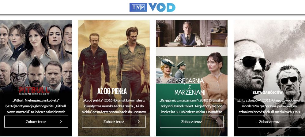VOD TVP Muestra películas, series y programas emitidos en la televisión polaca. Por lo tanto, tiene cientos de materiales en su colección, pero no todos están disponibles de forma gratuita. Esto se puede ver especialmente en la presentación de la película, que se proporciona principalmente a las personas que han comprado una suscripción a RTV. En TVP VOD, puede ver todos los episodios de series de TV y programas de entretenimiento que se muestran en los canales de TVP absolutamente gratis. Entonces, la selección gratuita en este sitio es bastante grande. No es necesario registrarse, pero con anuncios emergentes.