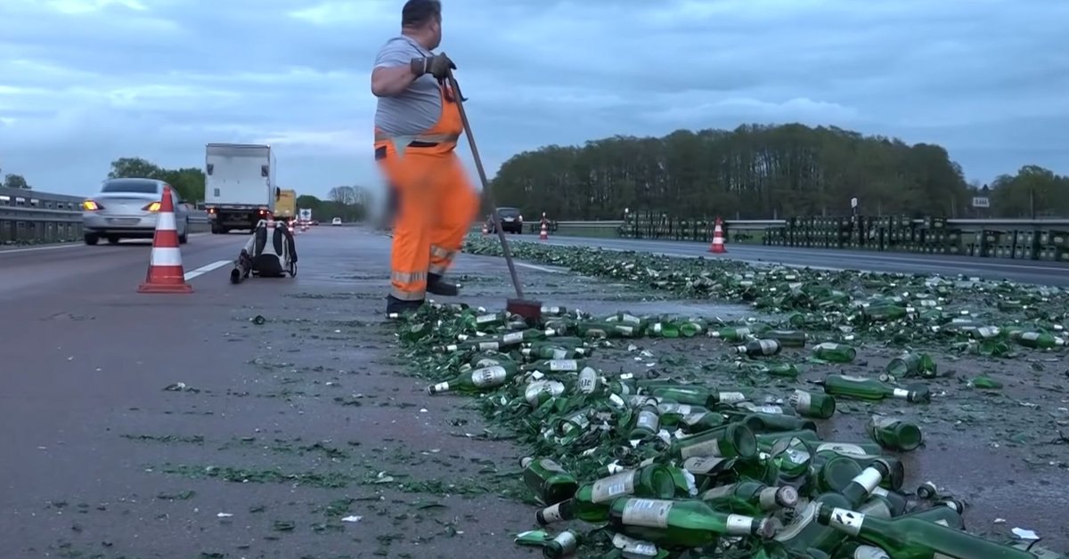 Cientos de cajas rotas dejaron miles de peligrosos vidrios en la carretera. El tráfico en las autopistas A1 y A28 se ha detenido por completo.