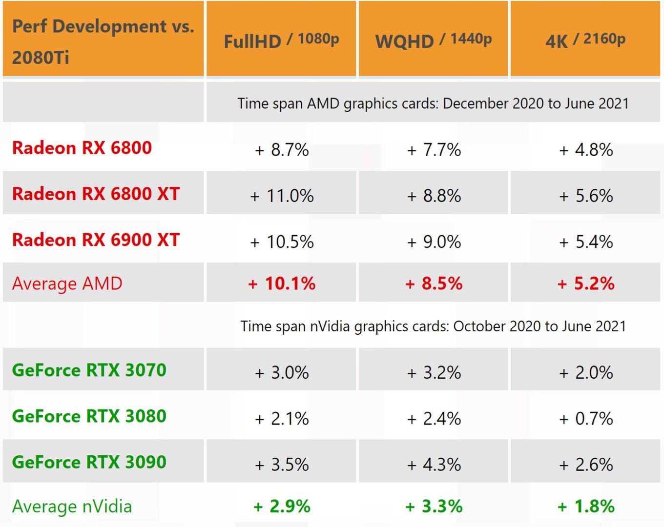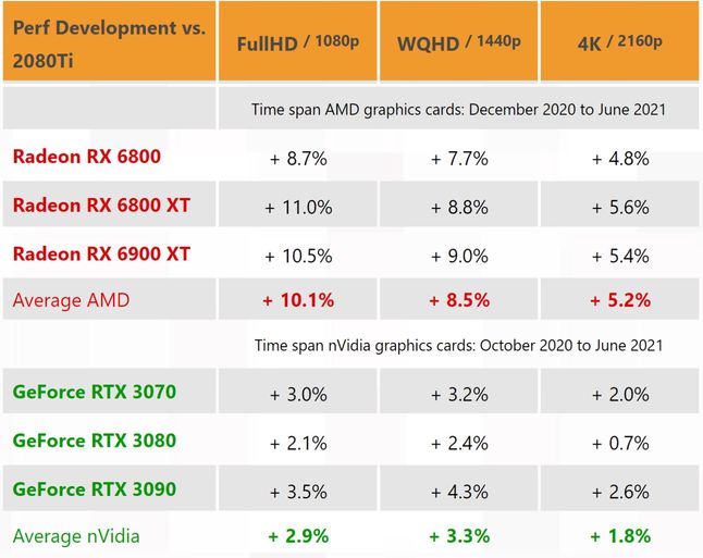 Según las mediciones realizadas en tres resoluciones, desde Full HD a 4K, después de unos seis meses de estar en el mercado, las tarjetas gráficas de la Radeon RX 6000 han ganado un promedio de hasta un 10 por ciento. actuación. Esto es tres veces más que el aumento promedio de las capacidades de las tarjetas Nvidia de la misma categoría.