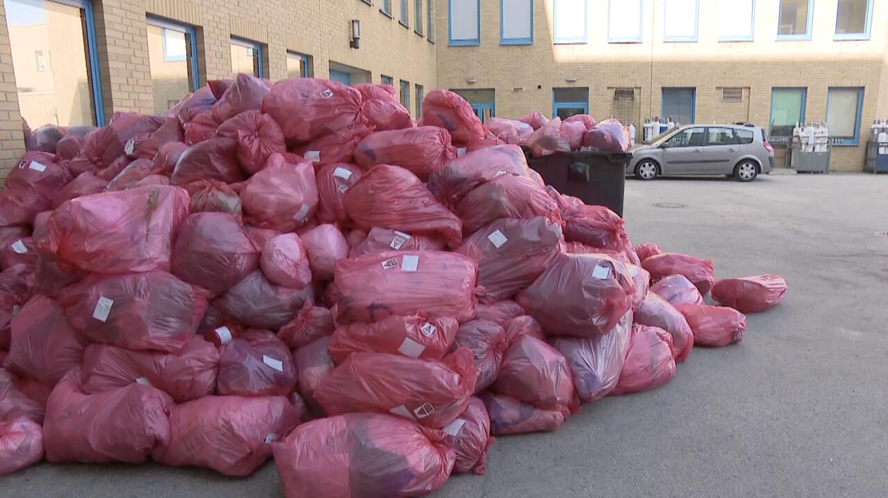 El miércoles recibimos información de que una pila de bolsas rosas crece frente al hospital en Radomsko con información de que hay desechos infecciosos para las personas en su interior: principalmente trajes, mascarillas y guantes usados que los médicos han usado en la lucha contra la pandemia de Coronavirus. . . La pila se derramó, como habían advertido nuestros informantes, fuera del almacén especialmente diseñado y se acumuló cerca del estacionamiento, justo al lado de donde se recibían las comidas.