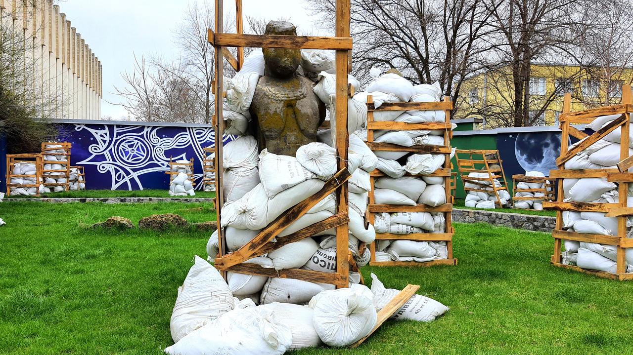 Sacos de arena protegen un antiguo monumento de oro tachonado en el río DniéperLa foto fue tomada el 17 de mayo de 2022.lucha de acciones